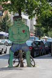 Keywords: hulk ugly fig sculpture monster creepy heart road street scene city germany scene city scene bike autos log green large sidewalk