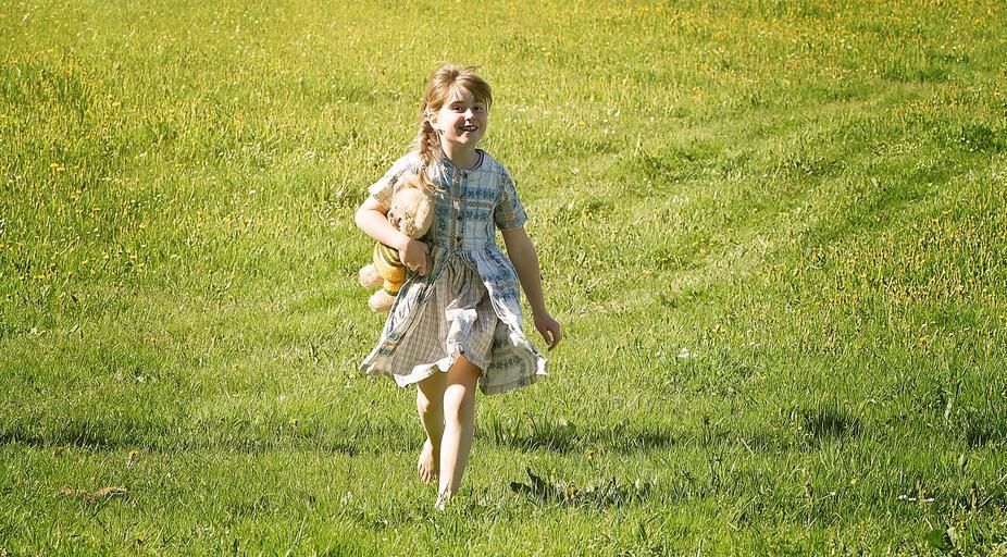 Keywords: human child girl dress meadow nature run happy laugh teddy bear