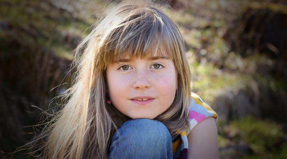 Keywords: human child girl face blond long hair sitting rest relaxed out nature portrait