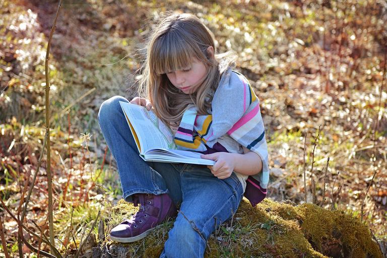 Keywords: human child girl sitting blond long hair book read have a look out nature