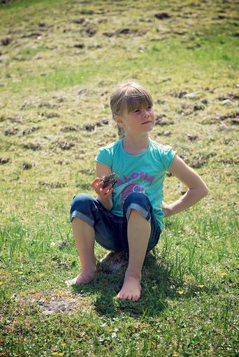 Keywords: human child girl with detent sitting meadow nature barefoot