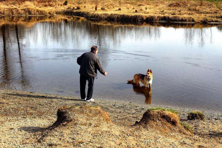 Keywords: human man dog pet love friendship happy male communication teach together person mates river park fun outdoors leisure diversity