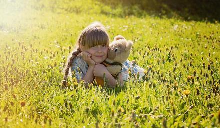 Keywords: human person child girl blond teddy teddy bear meadow grass nature out sunlight portrait