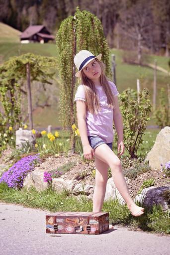 Keywords: human person child girl barefoot hat blond luggage road wait out nature portrait