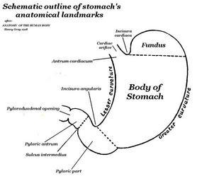 Keywords: Human Stomach schematic external anatomy.jpg en Schematic outline of external anatomical landmarks of human stomach Illustrates Cardiac region Fundus Body and Pyloric regions 2014-10-31 16 55 48 Adapted from Gray's Anatomy of Human body 1918 also in much earlier editions Gray Henry other versions Source of diagram Gray's Anatomy of the Human Body 20th edition Re-annotated PD-old-70-1923 Uploaded with UploadWizard Stomachs Fundus |