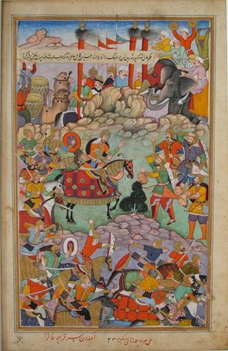 Keywords: Humayun Receives the Head of Qaracha Khan.jpg en Indian and Himalayan Art Humayun Receives the Head of Qaracha Khan Page from the dispersed manuscript of the first Akbarnama Narrative of the Emperor Akbar by Abu'l Fazl Made in Lahore Punjab Province Pakistan Asia c 1590 Ascribed to Burah Indian active 1580 - 1590 Faces ascribed to Miskin India active 1582 - 1596 Opaque watercolor and gold on paper 14 1/2 x 10 1/16 inches 36 8 x 25 6 cm Currently not on view 1947-49-1 Purchased with the George W B Taylor Fund 1947 Label This page from the first of several illustrated copies of the Akbarnama commissioned by the Emperor Akbar reveals how artists in the imperial Mughal workshop blended indigenous Indian and Persian painting traditions Indian features include the use of bold colors dramatic poses and substantial bodies Persian characteristics include the modulated colors fleshlike rocks forward-tilting picture plane and faces in smooth three-quarter profile Rather than being placed as a caption at the top or back of the page as in works done for Hindu patrons of the time the rectangle of text is placed in the middle of the composition following Persian tradition 1590 http //www philamuseum org/collections/permanent/50344 html mulR 15645 2 Ascribed to Burah Indian active 1580 - 1590 Faces ascribed to Miskin India active 1582 - 1596 PD-Art Uploaded with UploadWizard Akbarnama |