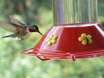 Keywords: Hummingbird and Bee.jpg Ruby-throated Hummingbird and wasp g 2 12 08 Garrett Davis Archilochus colubris in flight male Hummingbirds feeding