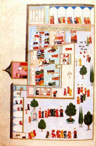 | Keywords: Hunername 24.jpg The Sultan following the cabinet session of the Imperial Council or Diwan-i Hümayun Ottoman miniature painting from the Hünername Topkapı Sarayı Müzesi Istanbul Inv 1523/24 http //www tuerkenbeute de/kun/kun_ges/StaatswesenVerwalt_de php Badisches Landesmuseum 1584 Ottoman miniature painter PD-old-100 Hünername Imperial Council Topkapı Palace Second Courtyard Topkapı Palace Topkapı Palace in art Topkapi 1584 Courtyards in art Turkey in the 16th century | ||||
