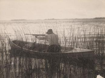 Keywords: canoes and canoeing canoesandcanoeing hunting outdoor monochrome Photographer: Reuben R. Sallows (1855 - 1937) Description: Man shooting rifle from kneeling position in canoe; back to photographer, rifle pointing left; wearing felt hat pulled down over ears, woollen sweater and dark pants; canoe positioned horizontally; reeds in foreground; water and distant shore in background; date (1909/77) in pencil and Sallows stamp in blue ink on back Object ID : 0419-rrs-ogohc-ph View additional photographs by Sallows that are held in other collections at the Reuben R. Sallows Digital Library. Order a higher-quality version of this item by contacting the Huron County Museum (fee applies). Photographer: Reuben R. Sallows (1855 - 1937) Description: Man shooting rifle from kneeling position in canoe; back to photographer, rifle pointing left; wearing felt hat pulled down over ears, woollen sweater and dark pants; canoe positioned horizontally; reeds in foreground; water and distant shore in background; date (1909/77) in pencil and Sallows stamp in blue ink on back Object ID : 0419-rrs-ogohc-ph View additional photographs by Sallows that are held in other collections at the Reuben R. Sallows Digital Library. Order a higher-quality version of this item by contacting the Huron County Museum (fee applies). |