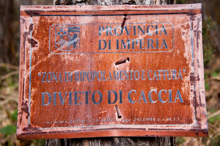 Keywords: hunting prohibited biological recovery nature reserve shield old rusted forest rust scratched fine typography italy