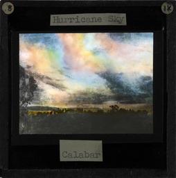 Keywords: "Hurricane Sky", Calabar, late 19th century (imp-cswc-GB-237-CSWC47-LS2-018).jpg en <br> Hurricane Sky Calabar late 19th century Image of a stormy sky over Calabar The image shows dark clouds over a flat landscape The sky is also lit by reds yellows and greens ; Mary Slessor the Scottish missionary lost her hut to a Calabar tornado when it hit the village of Ibaka Photographer Unknown Filename imp-cswc-GB-237-CSWC47-LS2-018 tif Coverage date circa 1880 Part of collection International Mission Photography Archive ca 1860-ca 1960 Type images Part of subcollection Photographs from the Centre for the Study of World Christianity University of Edinburgh U K ca 1900-ca 1940s Repository name Centre for the Study of World Christianity Archival file impaunpub_Volume7/1291 url Repository address The University of Edinburgh School of Divinity New College Mound Place Edinburgh EH1 2LX United Kingdom Geographic subject country Nigeria Format aacr2 1 lantern slide 8 x 8 cm Geographic subject continent Africa Rights Contact the repository for details Part of series Mary Slessor LS2 Repository email divinity-CSWC ed ac uk Subject lcsh Keyword Storms Date created circa 1880 Publisher of the digital version University of Southern California Libraries Subject aat genre landscapes representations Format aat lantern slides Legacy record ID impa-m68161 Access conditions http //www ed ac uk/schools-departments/divinity/research/centres/world-christianity/collections-resources File GB 237 CSWC47/LS2/18 1880 author http //digitallibrary usc edu/cdm/ref/collection/p15799coll123/id/64414 PD-old-70-1923 Magic lantern images Images from USC Digital Library uploaded by Fæ International Mission Photography Archive ca 1860-ca 1960 Calabar |