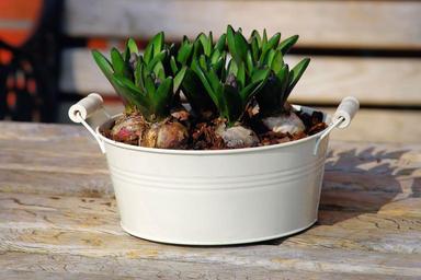 Keywords: hyacinth container onions basket metal white ornament deco table bank spring garden