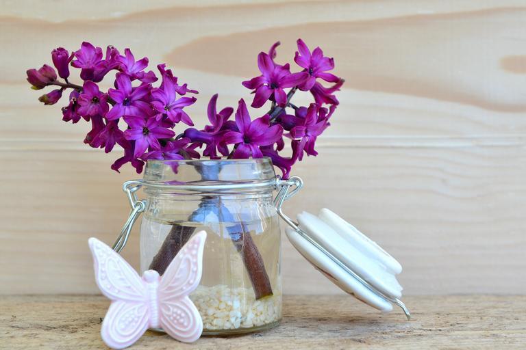 Keywords: hyacinth flower blossom bloom fragrant flower spring flower purple vase jar dekoschmetterling wood decoration