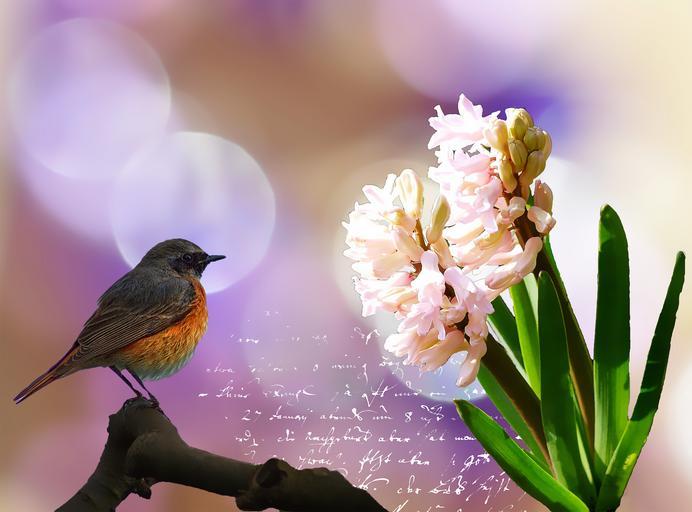 Keywords: hyacinth flower blossom bloom plant common redstart throttle bird handwriting bokeh romantic spring composing digital art painting digital painting greeting card