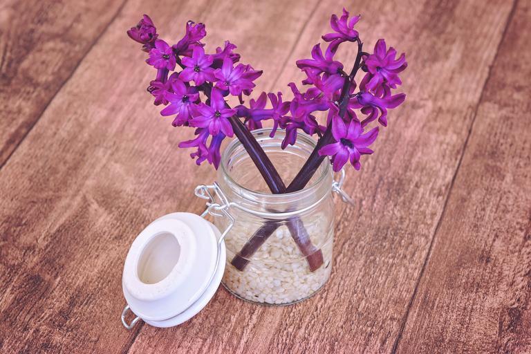 Keywords: hyacinth flower flowers fragrant flower fragrant pink purple decorative glass vase jar wood spring flower