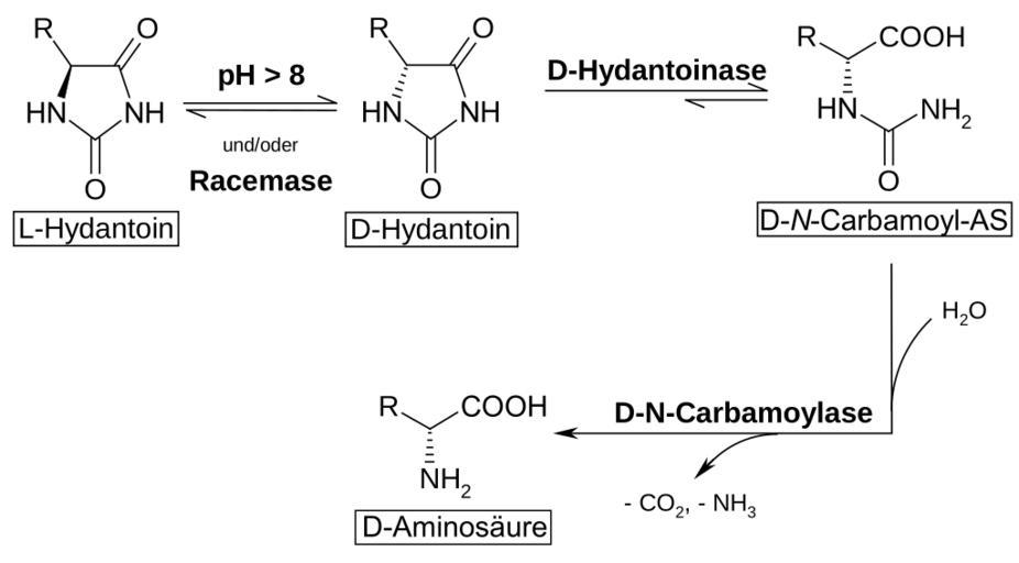 Keywords: Hydantoin-Synthese.svg Die Hydantoinase-Synthese der Degussa zur Produktion von D-Aminosäuren own made with Inkscape and BKChem 2012-09-21 Kuebi Armin Kübelbeck Hydantoin Chemical syntheses