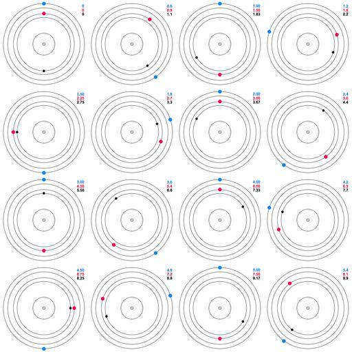 Keywords: Hydra, Nix, Styx conjunctions and oppositions cycle.png Pluto's moons Hydra blue Nix red and Styx black as controlled by their mutual orbital resonance The view is from the north pole of the system and all motions are counterclockwise The movements shown are actually a composite of orbital motion and orbital precession Libration is disregarded Numbers in the upper right corners of diagrams indicate the number of orbits completed by each moon since the first diagram a full cycle consists of 6 Hydra orbits 9 Nix orbits 11 Styx orbits plus 2 3 and 5 conjunctions and oppositions for Nix and Styx Hydra and Nix and Hydra and Styx respectively and would be represented by a return to the first diagram Notice that there are no triple conjunctions All orbits in the Pluto system are shown to scale but sizes of moons are not The diagrams were created using Wolfram Mathematica according to the results reported in Showalter M R ; Hamilton D P 3 June 2015 Resonant interactions and chaotic rotation of Pluto ™s small moons Nature 522 7554 45 “49 doi 10 1038/nature14469 2015-07-01 own WolfmanSF other versions <gallery>Hydra Nix Styx orbital resonance cycle png The resonance cycle of the 3 moons shown at intervals of 0 5 Hydra period<br> Hydra Nix Styx conjunctions cycle png All the conjunctions per resonance cycle of the 3 moons</gallery> cc-zero Uploaded with UploadWizard Moons of Pluto |