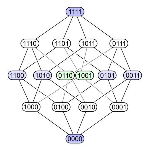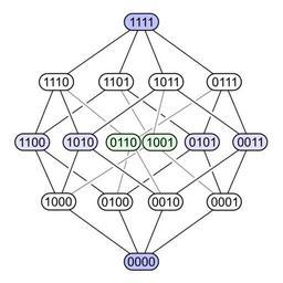 Keywords: Hypercubeorder binary.svg The <nowiki>4D-</nowiki>hypercube layered according to distance from one corner <br />As described in Alice in Wonderland by the Cheshire Cat this vertex-first-shadow of the tesseract forms a rhombic dodecahedron <br /> Note that the two central green vertices should coincide if using an orthogonal projection from 4 to 3 dimensions but were drawn here slightly apart <br /> The eight nibbles with odd binary digit sums form a cube and are marked in white <br /> The two pallindromes 0110 and 1001 compare XOR and XNOR are projected in the center of the rhombic dodecahedron and are marked in green <br /> The other six nibbles with even binary digit sums form an octahedron and are marked in blue <br> 300px Inkscape ValidSVG own 2010 Watchduck public domain 300px Rhombic dodecahedral tesseract shadow; 16 vertices 2-fold rotational symmetry Binary numeral system Tesseract Hasse diagrams Colored nibbles blue green white