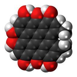 Keywords: Hypericin 3D spacefill.png Space-filling model of the hypericin molecule an antibiotic found in St John's wort Color code 505050 Carbon C black<br> F0F0F0 Hydrogen H white<br> F51E1E Oxygen O red<br> 2011-07-18 own DS Visualizer Jynto talk Ball-and-stick version cc-zero Images by Jynto Space-filling models Hypericin |