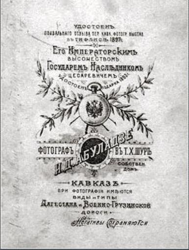| Keywords: I. Abuladze s photographic stamp. Daghestan. Temir Khan Shura.JPG  en I Abuladze s photographic stamp Daghestan Temir Khan Shura ka ილია აბულაძის ფ ტ სტუდიის შტამპი დაღესტა ი თემირხა შურა http //www photomuseum org ge/photographers/abuladze/abuladze_en htm photomuseum org ge en or http //www photomuseum org ge/photographers/abuladze/abuladze_ge htm photomuseum org ge ge Ilia Abuladze 1897 Source http //www photomuseum org ge/ www photomuseum org ge PD-old Dagestan Photos by Ilia Abuladze |