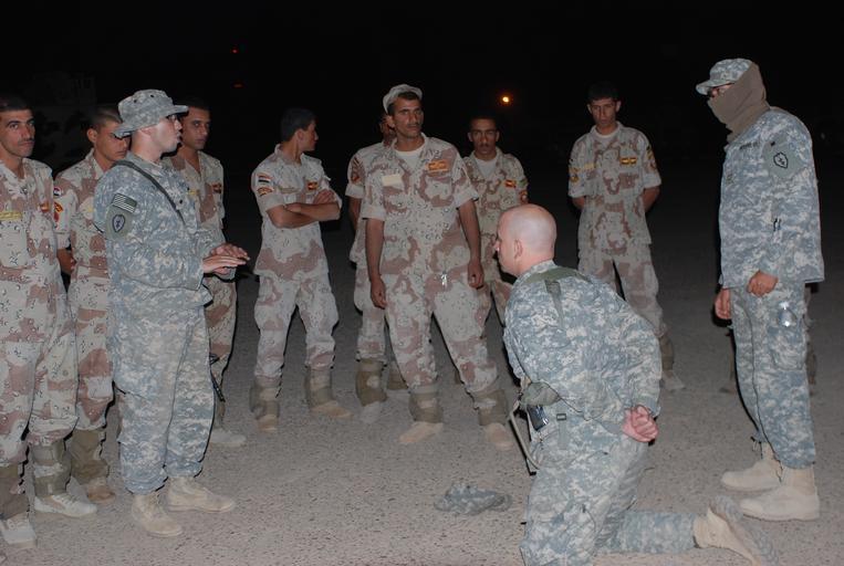 Keywords: IA, Gimlet MiTT conduct cache search during Operation Gimlet Tidal Wave DVIDS120913.jpg en Iraqi army soldiers from Commando Company 4th Battalion 24th Brigade 6th IA Division look on Oct 3 2008 as Spc Aaron Taylor a Billings Mont native rehearses how to properly detain and search a suspect with Maj Robert Risdon Jr a Chicago native and team chief of the Military Transition Team attached to 1st Battalion 21st Infantry Regiment 2nd Striker Brigade Combat Team 25th Infantry Division Multi-National Division “ Baghdad at Forward Operating Base Constitution 2008-10-03 Sgt Benjamin Crane https //www dvidshub net/image/120913 120913 2008-10-08 14 00 BAGHDAD IQ PD-USGov 21st Infantry Regiment United States 25th Infantry Division United States Images from DoD uploaded by Fæ |