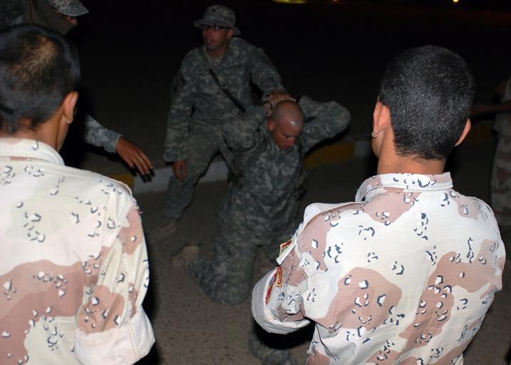 Keywords: IA, Gimlet MiTT conduct cache search during Operation Gimlet Tidal Wave DVIDS120914.jpg en Iraqi army soldiers from Commando Company 4th Battalion 24th Brigade 6th IA Division look on Oct 3 2008 as Spc Aaron Taylor a Billings Mont native demonstrates how to detain and search a suspect on Maj Robert Risdon Jr a Chicago native and team chief of the Military Transition Team attached to 1st Battalion 21st Infantry Regiment 2nd Striker Brigade Combat Team 25th Infantry Division Multi-National Division “ Baghdad at Forward Operating Base Constitution 2008-10-03 Sgt Benjamin Crane https //www dvidshub net/image/120914 120914 2008-10-08 14 01 BAGHDAD IQ PD-USGov 21st Infantry Regiment United States 25th Infantry Division United States Images from DoD uploaded by Fæ |