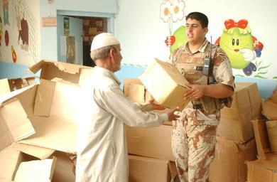Keywords: IA, MND-B Soldiers conduct medical operation DVIDS33048.jpg en BAGHDAD - A soldier from 5th Brigade 6th Iraqi Army Division distributes food to a local resident during a medical operation Saturday at the Al Karama Nursery School in western Baghdad Iraqi doctors nurses and medics provided free treatment for non-chronic illnesses and injuries and more than 600 community members were provided toys and food Soldiers from Multi-National Division - Baghdad's 2nd Battalion 1st Infantry Regiment 172nd Stryker Brigade Combat Team based out of Fort Wainwright Alaska and 414th Civil Affairs Battalion provided medical and security assistance for the Iraqi army medical personnel U S Army photo courtesy of 172nd SBCT MND-B 2006-11-17 https //www dvidshub net/image/33048 33048 2006-11-17 13 20 BAGHDAD IQ PD-USGov Fort Wainwright Images from DoD uploaded by Fæ |