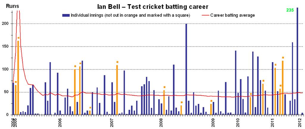 | Keywords: Ian Bell test batting career v1b.png This graph details the test match performance of cricketer w Ian Bell and was created by en wiki w user EdChem Each bar indicates a single test match innings blue ones for innings in which he was dismissed orange ones marked with a square for innings in which he batted but was not out The red line shows career batting average as at the end of each innings An alternative version w File Ian Bell test batting career v1a png shows the same data but with a different vertical scale Another file w File Ian Bell test batting career v2 png shows a 10 innings moving average instead of the career batting average <p>The graph was generated with Microsoft Excel 2003 the resulting chart being copied to Adobe Photoshop 9 and saved in png format using data from w Cricinfo http //stats espncricinfo com/ci/engine/player/9062 html class 1;orderby start;template results;type batting;view innings and w Howstat http //www howstat com au/cricket/Statistics/Players/PlayerProgressBat asp PlayerID 3207 This version is current as at 22 January 2012 which is also the date it was prepared en wikipedia FastilyClone MTC EdChem w other versions EdChem wikipedia en Cc-zero Original upload log page en wikipedia Ian+Bell+test+batting+career+v1b png wikitable - 2012-01-22 11 59 57 1243× 525× EdChem This graph details the test match performance of cricketer Ian Bell and was created by en wiki user EdChem Each bar indicates a single test match innings blue ones for innings in which he was dismissed orange ones marked with - Uncategorized 2016 July 24 |