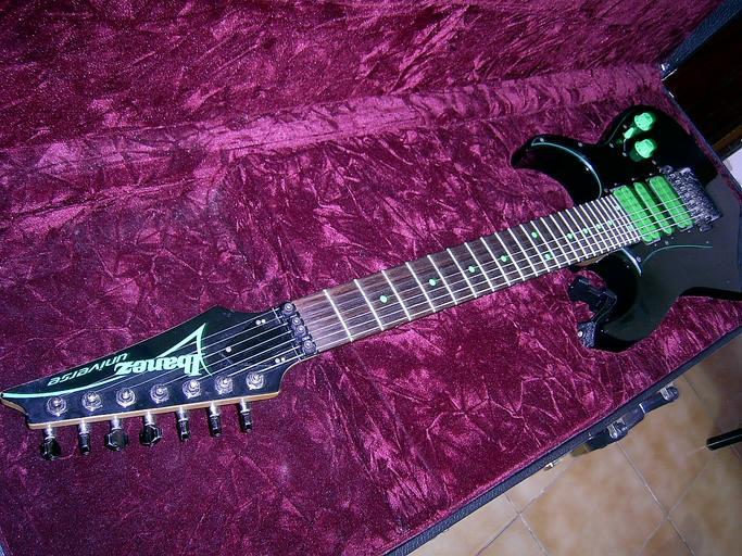 Keywords: Ibanez Universe UV7BK.jpg Ibanez Universe UV7BK year 1996 inside original hardcase Seven string guitar Own 2008-05-16 Rodrigo César Ibanez Universe
