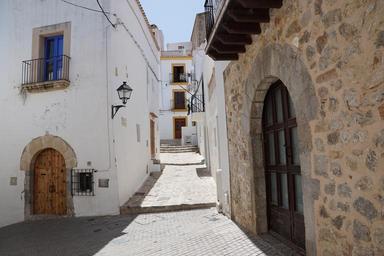 Keywords: ibiza eivissa city holiday alley road stones construction build spain old town goal door window white grey balcony stairs sidewalk rise