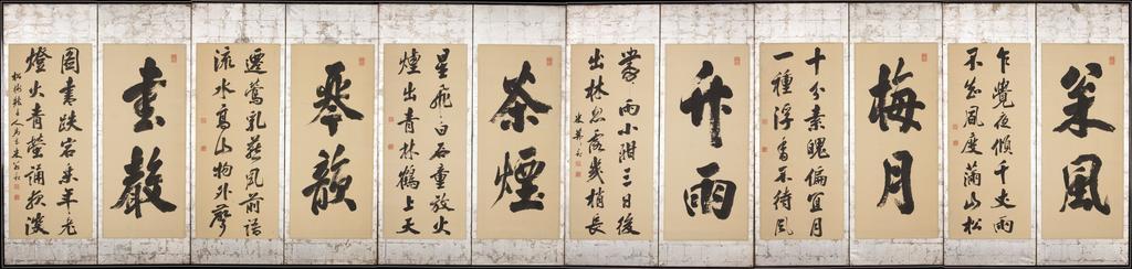 | Keywords: Ichikawa Beian - Pine wind, plum moon ... - Google Art Project.jpg ~ 1850 1779 1779 1858 1858 Ichikawa 28085326 BEIAN Japan 1779 - 1858 /collection/art-gallery-of-south-australia/artwork/pine-wind-plum-moon-ichikawa-beian/28089334/ Ichikawa BEIAN /artist/ E7 B1 B3 E8 8F B4- E5 B8 82 E6 B2 B3/28914178/ 28914178 /collection/art-gallery-of-south-australia/ Art Gallery of South Australia 27864259 http //artgallery sa gov au/ /collection/art-gallery-of-south-australia/artwork/pine-wind-plum-moon-ichikawa-beian/28089334/ 1840 c 1850 pair of six-panel screens ink on paper 173 28089334 False 1860 each 20036A42 a b http //www artgallery sa gov au/agsa/home/Collection/searchResult jsp main acc accNo 20036A42 a b http //www artgallery sa gov au/agsa/home/About/docs/copyright html Art Gallery of South Australia Gift of Andrew and Hiroko Gwinnett through the Art Gallery of South Australia Foundation 2003 Decorative Arts 1840 1870 Edo Tokyo w377 x h173 cm c 1850 False 4 19672131147541 © Art Gallery of South Australia Object pine-wind-plum-moon-ichikawa-beian Pine wind plum moon p 377 pair of six-panel screens ink on paper special url_id 3QFwyMdsLNfZ-Q PD-old-100-1923 1858 Google Art Project works by Ichikawa Beian Japanese calligraphy in the Edo period |
