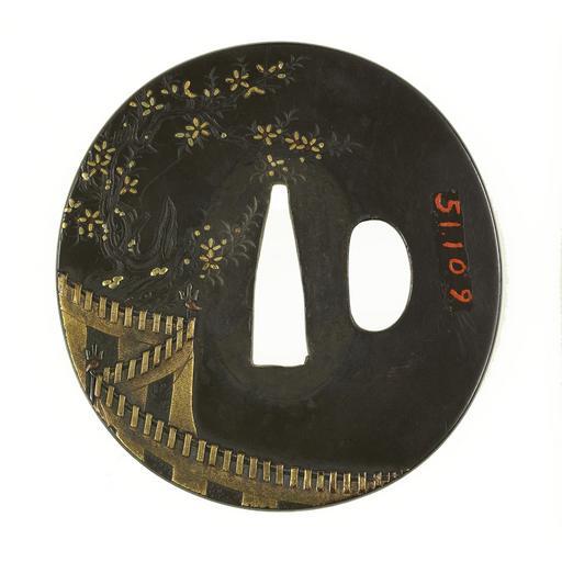 | Keywords: Ichinomiya Nagatsune - Tsuba with the Elegant Gathering in a Peach Orchard - Walters 51109 - Back.jpg This tsuba shows the Chinese figures Genroku Ch Liu Bei Kanyu Ch Guan Yu and Chôhi Ch Zhang Fei in the peach orchard where they took an oath of brotherhood The episode takes place in the 14th-century novel Romance of the Three Kingdoms which tells a fictionalized account of events in the 2nd century during the Three Kingdoms period All three men led soldiers in victorious battle and Genroku became emperor of China The back depicts cloths hung to create an enclosure for a picnic in the orchard between 1732 1787 Edo shibuichi with gold and copper details cm 7 28 7 08 0 42 accession number 51 109 27108 Henry Walters Baltimore date and mode of acquisition unknown Walters Art Museum Henry Walters Acquired by Henry Walters Signature Nagatsune place of origin Kyoto Japan Walters Art Museum license Tsuba in the Walters Art Museum Ichinomiya Nagatsune Media contributed by the Walters Art Museum needs category review Oath of the peach garden |