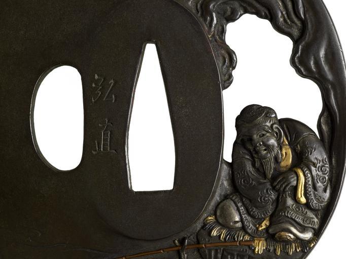 | Keywords: Ichiyôsai Hironao - Tsuba with Taikobo (Ch Tai Gongwong) Fishing without Bait - Walters 51191 - Mark.jpg At the right of this tsuba sits the sage Taikôbô Ch Tai Gongwang fishing His tea pot and basket are sitting behind him on the reverse Taikôbô did not use bait because he did not actually want to catch fish He used fishing as an excuse to think about scientific questions He met 12th-century BC emperor Wu Wang when the emperor was hunting and Taikôbô was fishing The emperor was so impressed with Taikôbô that he asked him to serve as a counselor Taikôbô served the emperor for twenty years 1st half Other date century 19 late Edo shibuichi gold cm 6 7 6 2 accession number 51 191 21758 Henry Walters Baltimore date and mode of acquisition unknown Walters Art Museum Henry Walters Acquired by Henry Walters Signature Hironao Déjà Vu Recurrence The Walters Art Museum Baltimore 2007-2008 place of origin Mito Japan Walters Art Museum license Tsuba in the Walters Art Museum Ichiyôsai Hironao Media contributed by the Walters Art Museum needs category review |