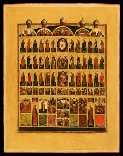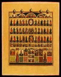 | Keywords: Iconostasis icon (19th c., Russia, priv coll).jpg  Miniature Iconostasis / Private Collection Germany The icon painted in fine detail reproduces in miniature the icon screen that separates the nave from the sanctuary in the orthodox church The icon is divided in six registers The lower register is centred by the Royal Door with two more doors depicting deacons to the left and to the right Between the doors large icons are depicted showing the Synaxis of the Archangels St Nicholas the Pokrov of the Mother of God the Trinity the Beheading of St John the Forerunner and the Dormition The second row depicting fourteen icons with the most important feasts of the orthodox church the third row depicting the Deesis centred by Christ Enthroned the fourth row depicting the prophets holding open text scrolls in their hands en praying to the Mother of God Enthroned in the centre the fifth row depicting more prophets and forefathers also holding text scrolls and with God Father in the centre the sixth row depicting saints and scenes from the Passion of Christ http //www morsink com/russian-icons/miniature-iconostasis-p-20 second half 19th century RusIcon PD-old-100 Files uploaded by Shakko from various sources Private collections of Russian art 19th-century icons of Russia Icons of Old Testament figures Iconostases in Russia Multiple-images icons |