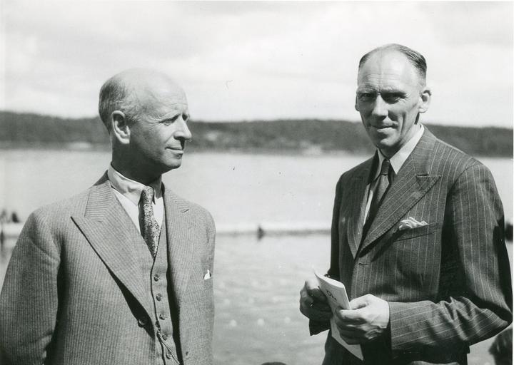 Keywords: idrett andre verdenskrig andreverdenskrig nordmenn i sverige under krigen nordmennisverigeunderkrigen 2. verdenskrig 2verdenskrig sport okkupasjonstiden people blackandwhite black and white I dagene 1., 2. og 3. august 1944 arrangertes i Stockholm krigsmesterskapet i svømning, fotball og friidrett. Bildet viser minister Jens Bull (t.v.) i samtale med militærattacheen oberst Ole Berg, under svømmestevnet på Bosöen 1. august. RA/PA-1209/Uc/71/4/ S 5126 I dagene 1., 2. og 3. august 1944 arrangertes i Stockholm krigsmesterskapet i svømning, fotball og friidrett. Bildet viser minister Jens Bull (t.v.) i samtale med militærattacheen oberst Ole Berg, under svømmestevnet på Bosöen 1. august. RA/PA-1209/Uc/71/4/ S 5126 |