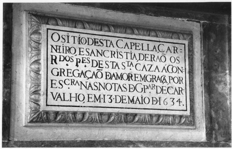 Keywords: talha portugal robert smith robert chester smith robertchestersmith igreja de são roque igrejadesãoroque igreja fundação calouste gulbenkian fundaçãocaloustegulbenkian plaque font lisboa biblioteca de arte bibliotecadearte Inscrição lateral na nave. Talha dos séculos 17-18. Fotógrafo: Robert Chester Smith (1912-1975). Data de produção da fotografia original: 1962-1964. Transcrição do texto da inscrição: "O sítio desta capella, carneiro (?), e sancristia derão os reverendos padres desta Santa Caza á Congregação de Amor em Graça por escritura nas Notas de Gaspar de Carvalho em 13 de Maio de 1634." [CFT008.0559.ic] Inscrição lateral na nave. Talha dos séculos 17-18. Fotógrafo: Robert Chester Smith (1912-1975). Data de produção da fotografia original: 1962-1964. Transcrição do texto da inscrição: "O sítio desta capella, carneiro (?), e sancristia derão os reverendos padres desta Santa Caza á Congregação de Amor em Graça por escritura nas Notas de Gaspar de Carvalho em 13 de Maio de 1634." [CFT008.0559.ic] |