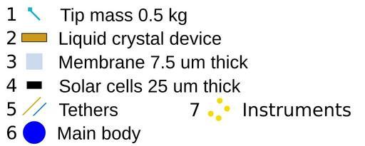 | Keywords: Ikaros solar sail key liberation and dejavu sans.svg  Ikaros solar sail when unfurled facing the sun With Liberation Sans font Expanded key 1 blue square on a line Tip mass 0 5 kg 1 of 4 2 orange rectangle Liquid crystal device 1 of 80 3 blue square Membrane 7 5 um thick 20 metres diameter 4 black rectangle Solar cells 25 um thick 1 of many 5 yellow and blue lines Tethers 6 blue disc Main body 7 yellow dots Instruments Any rendering problems are probably due to wikimedia software See key with alternative DejaVu Sans font in File Ikaros solar sail key svg self-made by 84user after looking at references at http //www jaxa jp/press/2010/06/20100611_ikaros_e html Small Solar Power Sail Demonstrator 'IKAROS' Successful Solar Sail Deployment and JAXA's YouTube video http //www youtube com/watch v 7_6HOqBkP2o 2010-06-12 84user thumb left Alternative key with numbers only thumb left Alternative key with Liberation Sans font in an attempt to find a solution to rendering problems with Inkscape and wikimedia The Opera browser renders all these SVG files fine thumb left Sun-facing IKAROS diagram without key thumb left Numbered key to sun-facing IKAROS diagram with DejaVu Sans font thumb left Sun-facing IKAROS diagram with numbers-only key at bottom thumb left Sun-facing IKAROS diagram plus numbered key with DejaVu Sans font thumb left version using Liberation Sans for Instruments text kerning errors validSVG http //validator w3 org/check uri Created with Inkscape Diagram legends Legend in English IKAROS Illustrations of spacecraft SVG spaceflight |