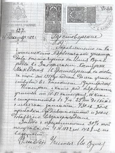 | Keywords: Ilya Vulev certificate.jpg en Iliya Vulev's certificate as a teacher in primary school in the village of Kalotina Bulgaria signed by himself as a head teacher December 4th 1922 bg Копие на удостове ение на Илия Вулев като учител в а одното пъ воначално училище в село Калотина подписано от самия него като главен учител 4 декемв и 1922 г Цент ален дъ жавен а хив ф 166 К оп 1 а е 1614 л 83 Author 4 декемв и 1922 PD-old Documents in Bulgarian Manuscripts Kalotina | ||||