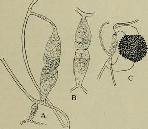 <em>Please note that these images are extracted from scanned page images that may have been digitally enhanced for readability - coloration and appearance of these illustrations may not perfectly resemble the original work.</em> bookcentury1900 booksubjectbotany bookdecade1910 bookyear1910 bookpublishernewyorkhholtandcompany bookauthoratkinsongeorgefrancis18541918 bookcollectionamericana bookcollectionblc bookcontributorwellesleycollegelibrary bookcollectionwellesleycollegelibrary booksponsorbostonlibraryconsortiummemberlibraries bookleafnumber271 bhlcollection bookidbotanyforhighsch00atki Rhizopus nigricans.jpg Rhizopus nigricans Different stages in conjugation of + and ” strains to form zygospores mycelium which are of an opposite sex nature One cannot dis- tinguish between male and female according to the size and appear- ance of the conjugating branch though sometimes at a later stage one becomes much larger than the other The branches meet at their ends and each swells into a club-shaped body A cross wall now cuts off a body of protoplasm in the end of each branch https //www flickr com/photos/internetarchivebookimages/19785167463/in/photolist-w9m9YX-xJY3EP-xrWFDw-x7AN7x-oeBStb-xE9jqy-wCra3B-xzTypJ-xELDZ8-xE1cqm-wSBfD3-xnL2zf-wL5eNc-t8JPhh-xB4AWk-xEDYZb-xf7c6W-wJ5gLH-xELF46-xf1kgK-xcMruC-xBts4u-x2Zwv2-yjMo6V-tNarjA-wEzBLD-wXw1qJ-oeRDrR-owjyNL-xA2x6V-x1GAME-wi3hqn-xeUCtr-x6LHvR-wHVNNG-w975kY-wboAKS-xFGGeM-xbMc5B-w3Gcpf-xCdtCy-oujwbs-xCCi7W-xjQEPw-xBsa9X-w9m8dc-xzVCnj-xp4e9o-wXiAUf-wJXxf2 1910 Atkinson George Francis Zygomycota Rhizopus PD-old |