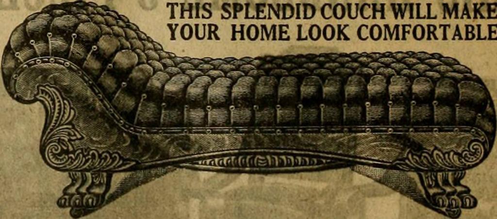 | Keywords: bookid:catalogueno16spr00macy bookidcatalogueno16spr00macy bookyear:1911 bookyear1911 bookdecade:1910 bookdecade1910 bookcentury:1900 bookcentury1900 bookauthor:macy_s__firm_ bookauthormacysfirm booksubject:department_stores__catalogs booksubjectdepartmentstorescatalogs booksubject:trade_catalogs__department_stores_ booksubjecttradecatalogsdepartmentstores bookpublisher:r_h__macy__new_york bookpublisherrhmacynewyork bookcontributor:winterthur_museum_library bookcontributorwinterthurmuseumlibrary booksponsor:lyrasis_members_and_sloan_foundation booksponsorlyrasismembersandsloanfoundation bookleafnumber:341 bookleafnumber341 bookcollection:winterthurlibrary bookcollectionwinterthurlibrary bookcollection:americana bookcollectionamericana monochrome indoor bookid:catalogueno16spr00macy bookidcatalogueno16spr00macy bookyear:1911 bookyear1911 bookdecade:1910 bookdecade1910 bookcentury:1900 bookcentury1900 bookauthor:macy_s__firm_ bookauthormacysfirm booksubject:department_stores__catalogs booksubjectdepartmentstorescatalogs booksubject:trade_catalogs__department_stores_ booksubjecttradecatalogsdepartmentstores bookpublisher:r_h__macy__new_york bookpublisherrhmacynewyork bookcontributor:winterthur_museum_library bookcontributorwinterthurmuseumlibrary booksponsor:lyrasis_members_and_sloan_foundation booksponsorlyrasismembersandsloanfoundation bookleafnumber:341 bookleafnumber341 bookcollection:winterthurlibrary bookcollectionwinterthurlibrary bookcollection:americana bookcollectionamericana monochrome indoor bookid:catalogueno16spr00macy bookidcatalogueno16spr00macy bookyear:1911 bookyear1911 bookdecade:1910 bookdecade1910 bookcentury:1900 bookcentury1900 bookauthor:macy_s__firm_ bookauthormacysfirm booksubject:department_stores__catalogs booksubjectdepartmentstorescatalogs booksubject:trade_catalogs__department_stores_ booksubjecttradecatalogsdepartmentstores bookpublisher:r_h__macy__new_york bookpublisherrhmacynewyork bookcontributor:winterthur_museum_library bookcontributorwinterthurmuseumlibrary booksponsor:lyrasis_members_and_sloan_foundation booksponsorlyrasismembersandsloanfoundation bookleafnumber:341 bookleafnumber341 bookcollection:winterthurlibrary bookcollectionwinterthurlibrary bookcollection:americana bookcollectionamericana monochrome indoor bookid:catalogueno16spr00macy bookidcatalogueno16spr00macy bookyear:1911 bookyear1911 bookdecade:1910 bookdecade1910 bookcentury:1900 bookcentury1900 bookauthor:macy_s__firm_ bookauthormacysfirm booksubject:department_stores__catalogs booksubjectdepartmentstorescatalogs booksubject:trade_catalogs__department_stores_ booksubjecttradecatalogsdepartmentstores bookpublisher:r_h__macy__new_york bookpublisherrhmacynewyork bookcontributor:winterthur_museum_library bookcontributorwinterthurmuseumlibrary booksponsor:lyrasis_members_and_sloan_foundation booksponsorlyrasismembersandsloanfoundation bookleafnumber:341 bookleafnumber341 bookcollection:winterthurlibrary bookcollectionwinterthurlibrary bookcollection:americana bookcollectionamericana monochrome indoor Identifier: catalogueno16spr00macy Title: Catalogue no. 16, spring/summer / R. H. Macy & Co. Year: 1911 (1910s) Authors: Macy's (Firm) Subjects: Department stores--Catalogs Trade catalogs--Department stores. Publisher: R.H. Macy, New York Contributing Library: Winterthur Museum Library Digitizing Sponsor: Lyrasis Members and Sloan Foundation View Book Page: Book Viewer About This Book: Catalog Entry View All Images: All Images From Book Click here to view book online to see this illustration in context in a browseable online version of this book. Text Appearing Before Image: THIS SPLENDID COUCH WILL MAKEYOUR HOME LOOK COMFORTABLE Text Appearing After Image: This couch i9 strongly built of the best material. The frame work is made of choice hardwoods, thoroughly seasoned and kiln dried. The base rails are quite massive. The neatraised coverings at the head and foot arc entirely plain, giving it the quiet, rich appearanceof genuine leather, Tl.e iiUing is fine tow with elastic cotton top. The spring work Is ofIndestructible construct km throughout, consisting of the best quality spiral steel. ^8 8prings.spring edge, heavy duck canvas. Covered in Moroccoline, Imitation leather; size over all■27x7-i inches, weight S5 lbs. Shipped direct from factory in New York State. - . - _ - 4IB35005 Couch. Price. $10.24 This (lagant tauch ti «f tturdy MMtfuctlon. TAe miwlw baM rail on either aideexceedingly wl4s and Mna entirely plain, ol»er« an excellent ooportunlty lor the apolicatiof golden sak floaa DnUll. Venewtd with iiuarlfi sawed nalt. Tlie spring work Is over al>coiislruction, best quality wire. 2S springs in hip, apilng edge. The flUlDs Note About Images Please note that these images are extracted from scanned page images that may have been digitally enhanced for readability - coloration and appearance of these illustrations may not perfectly resemble the original work. Identifier: catalogueno16spr00macy Title: Catalogue no. 16, spring/summer / R. H. Macy & Co. Year: 1911 (1910s) Authors: Macy's (Firm) Subjects: Department stores--Catalogs Trade catalogs--Department stores. Publisher: R.H. Macy, New York Contributing Library: Winterthur Museum Library Digitizing Sponsor: Lyrasis Members and Sloan Foundation View Book Page: Book Viewer About This Book: Catalog Entry View All Images: All Images From Book Click here to view book online to see this illustration in context in a browseable online version of this book. Text Appearing Before Image: THIS SPLENDID COUCH WILL MAKEYOUR HOME LOOK COMFORTABLE Text Appearing After Image: This couch i9 strongly built of the best material. The frame work is made of choice hardwoods, thoroughly seasoned and kiln dried. The base rails are quite massive. The neatraised coverings at the head and foot arc entirely plain, giving it the quiet, rich appearanceof genuine leather, Tl.e iiUing is fine tow with elastic cotton top. The spring work Is ofIndestructib
