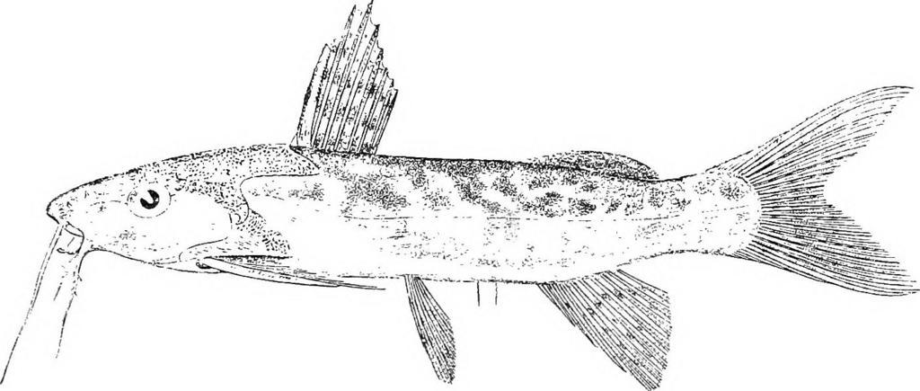 <em>Si/twdontis iiehdosus. Type, after Peters (Reise Mossamb.). if. barbel not margined, a little shorter than head, reaching a little beyond base of pectoral spine; outer mandibular barbels twice as long as inner, with short simple branches, inner with very short, bifid branches. Gill-opening not extending downwards beyond base of pectoral spine. Occipito-nuchal shield rugose like the occiput, as long as broad, posterior processes pointed. Humeral process not longer than broad, obtusely pointed, not extending so far back as occipito-nuchal process. Dorsal I 7 ; spine shorter than head, smooth in front, serrated behind. Adipose dorsal about 5 times as long as deep, as long as its distance from rayed dorsal. Anal IV 8, pointed in front. Pectoral spine shorter than head, feebly serrated on outer border, strongly on inner. Ventral nearly reaching anal. Caudal deeply notched. Caudal peduncle a little longer than deep. Yellowish green above, with ill-defined, irregular</em>