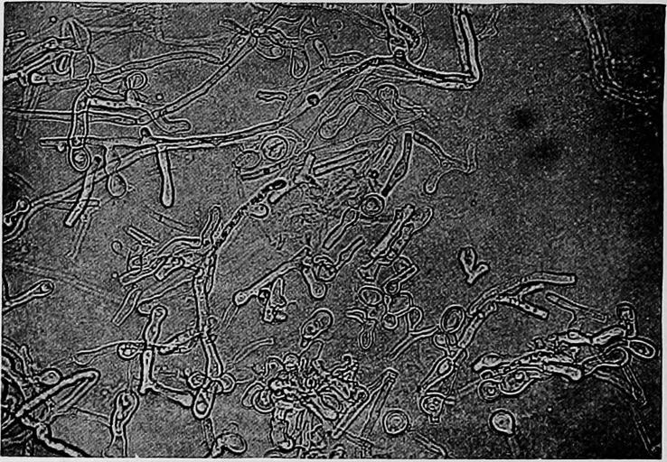 <em>Fig. 321.—Blastomyces dermatitidis. Budding forms and mycelial growths from glucose agar (Irons and Graham, in "Journal of Infectious Diseases"). a few weeks the agar-agar begins to turn yellow and later may be- come brown, though the growth itself remains white and unchanged. The growth is firmly attached to the agar. When old, the growth wrinkles. Bouillon.—The growth is not luxuriant. The medium is not clouded and contains fluffy flocculi of stringy viscid material. Sugars added to the medium may be fermented. Gelatin.—Growth takes place with aerial hypha. Liquefaction does not occur or is very slow. Potato.—Abundant growth with aerial hypha. Milk.—Not coagulated, not acidified, slowly digested. There is some diflSculty in describing the cultures, as different authors describe them quite differently, evidently having different organisms or different strains under observation.</em>