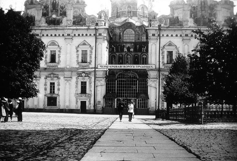 | Keywords: Ченці - криваві вороги трудящих.jpg en Soviet antireligious propaganda at the entrance to the Dormition Cathedral of the Kyivan Cave Monastery in Kyiv Monks - bloody enemies of the working class uk Совєтська анти елігійна п опаґанда над головним входом до Успенської катед и Києво-Пече ського монасти я Ченці - к иваві во оги т удящих http //sovietera net/articles/articles/15/1930-e sovietera net author s 1930 PD-Ukraine History of Dormition Cathedral of the Kyivan Cave Monastery Exterior of Dormition Cathedral of the Kyivan Cave Monastery Propaganda of the Soviet Union Atheism in the Soviet Union Anti-religious campaign in the Soviet Union |