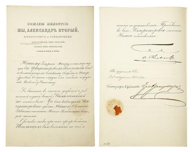 | Keywords: Наградной документ на Всеволода Сипягина.jpg  en Award document awarding Vsevolod Sipyagin Order of St Vladimir 2nd degree ru  аг адной документ о наг аждении Всеволода Сипягина о деном Святого Владими а 2-й степени http //www auction-imperia ru/wdate php t offline i 4537 Импе ато Александ II 30 августа 1875 года PD-RusEmpire Order of St Vladimir |