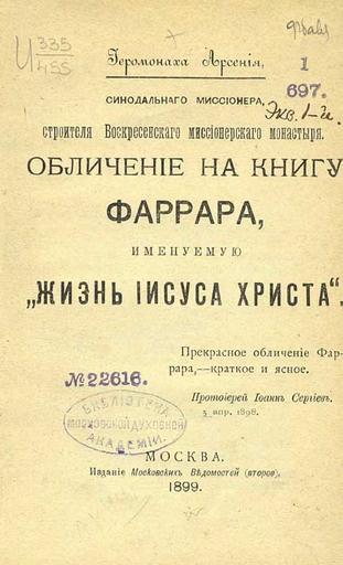 | Keywords: Арсений, иеромонах. Обличение на книгу Фаррара, именуемую „Жизнь Иисуса Христа“ (title pagе).jpg ru А сений ие омонах Обличение на книгу Фа а а именуемую Жизнь Иисуса Х иста 1899 unknown А сений ие омонах Custom license marker 2012 10 03 PD-RusEmpire Uploaded with UploadWizard Books from Russia 1899 Title pages from Russia Title pages uploaded by Steven Pavlov from various sources | ||||