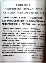 View Original:Решение внеочередной сессии Областного совета, 20 ноября 1991 г. Об изменениях в тексте бюллетеня для голосования на референдуме.jpg (665x906)