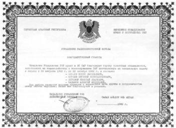 View Original:Грамота, подписанная дивизионным генералом С. А. эль Ашрамом группе специалистов РТР ЦНИИ-108.jpg (727x528)