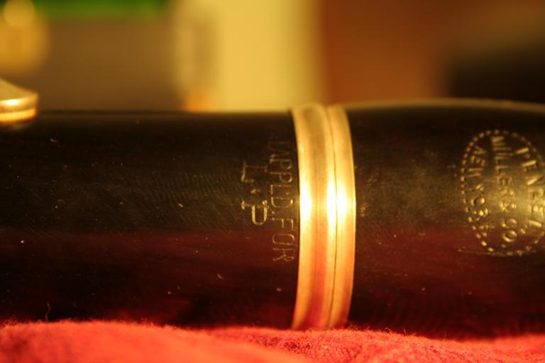 | Keywords: penzal müller mueller clarinet a wood vintage Patent Applied For followed by L.P. Apparently at some point around the turn of the century, people decided that the frequency that the notes of western music were at, should actually be a bit lower than they had been being played up until then. The L.P. here indicates Low Pitch, which is the tones we are used to. The example being the A, at what we know it to be, 440 Hz. The previous frequency was around 452 Hz. Patent Applied For followed by L.P. Apparently at some point around the turn of the century, people decided that the frequency that the notes of western music were at, should actually be a bit lower than they had been being played up until then. The L.P. here indicates Low Pitch, which is the tones we are used to. The example being the A, at what we know it to be, 440 Hz. The previous frequency was around 452 Hz. |