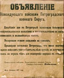 | Keywords: Объявление командующего войсками Петрогардского военного округа 25 февраля 1917.jpg Объявление командующего войсками Пет ог адского военного ок уга С С Хабалова о п именении о ужия для азгона манифестаций 25 фев аля 1917 Госуда ственный музей политической исто ии России original 25 фев аля 1917 года ста ый стиль ; photo - 29 11 2008 George Shuklin <span class signature-talk >talk</span> PD-old February Revolution in Russia 1917 in Saint Petersburg | ||||