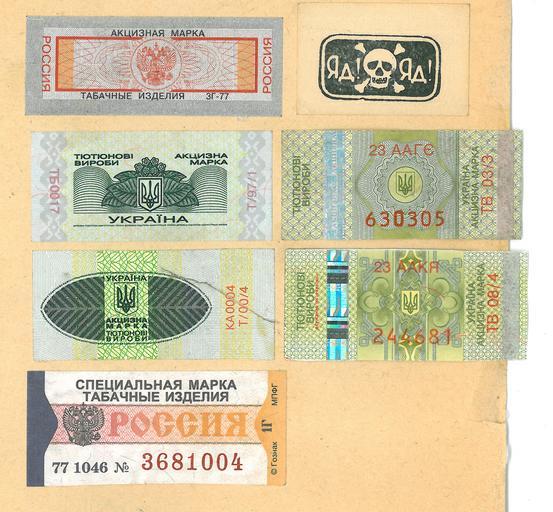 | Keywords: Табачные акцизные марки России Украины.jpg Акцизные ма ки на табачные изделия све ху вниз 1 - России 1994 года осква ; 2 - Ук аины 1996 года 3 - Ук аины 2000 года 4 - России 2002 года осква ; 6 - Ук аины 2003 года Че касская область ; 7 - Ук аины 2008 года Че касская область в х онологическом по ядке с 1990х по 2008 све ху вниз и слева нап аво по двум столбцам Также 5 - этикетка для лека ств Яд для советских аптек 1930-х годов scan by User Vizu 1930s end 1990s-2008 Ukraine NBY Russia Goznak PD-UA-exempt revenue stamps PD-RU-exempt revenue stamps PD-old Revenue stamps of Ukraine Tridents on stamps Stamps of Russia unidentified year Various stamps in one image Stamps of Russia to be categorised by subject |